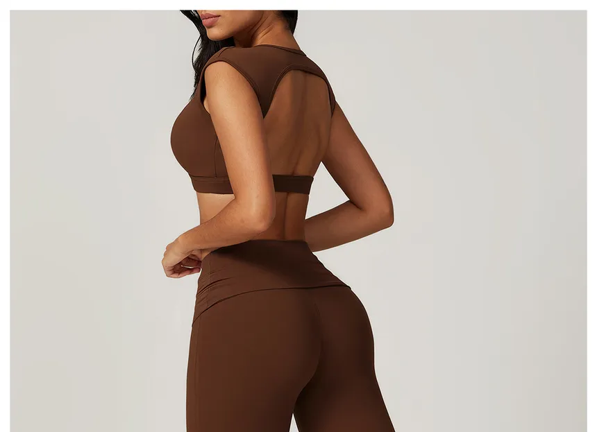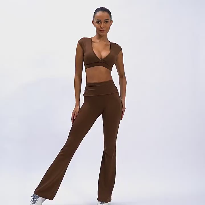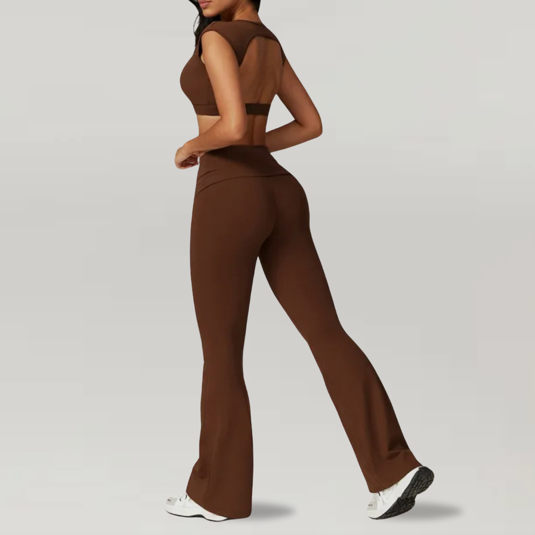 Elevate your workout wardrobe with this stylish and functional activewear set, the Chestnut Set by MAUV. Featuring a chic sleeveless crop top with an open-back design, this set combines both style and breathability, perfect for intense workout sessions or casual workout attire. The matching high-waisted flare pants are designed to hug your curves in all the right places, offering a flattering fit while allowing freedom of movement for any exercise.